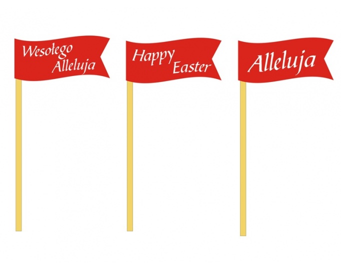 Chorągiewki Wielkanocne papierowe występują w różnych napisach,1 kolor czerwony tła. Idealnie nadają się jako dodatek do wyrastającej rzeżuchy czy też owsa lub innych artykułów świątecznych. W Polsce od wielu lat istnieje piękny zwyczaj przystrajania w ten sposób wielkanocnych specjałów.