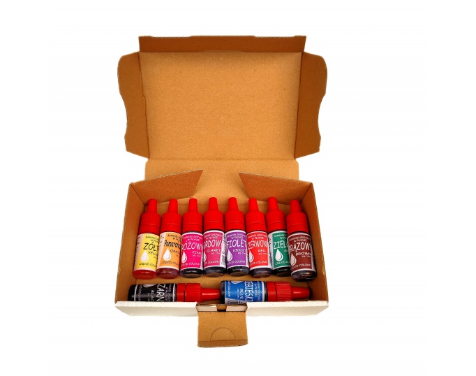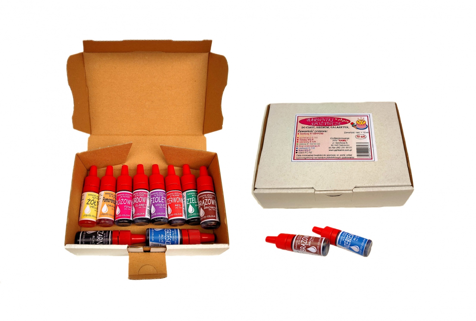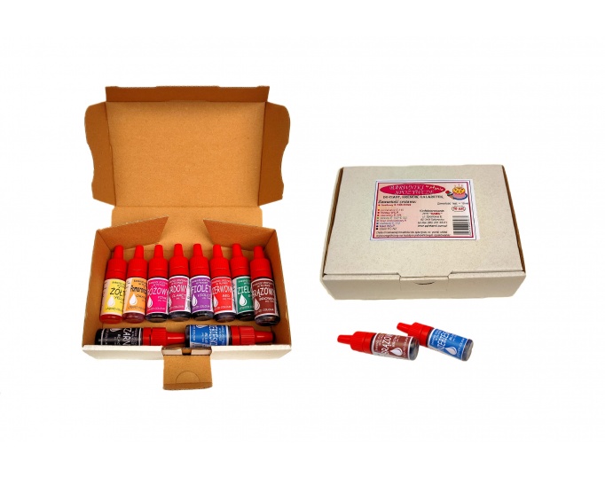 Zestaw najpopularniejszych kolorów zapakowanych w jedno opakowanie zbiorcze, dzięki czemu mamy zawsze pełną gamę kolorów gotowych do użycia. Zestaw barwników w płynie zawiera